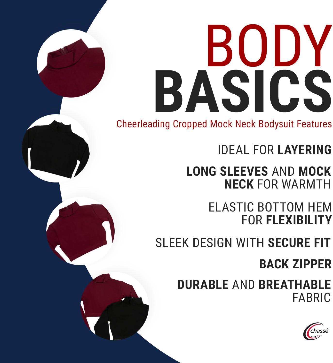 Stay confident, warm, and coordinated with the Chassé Girls Long Sleeve Cropped Bodysuit, an essential layering piece for cheerleaders. Designed with a mock neck and back zipper for easy wear, this cheer top slips smoothly under your uniform for added coverage on cool game days or indoor practices. The 4-way stretch fabric moves with your every motion, offering breathability and support through stunts, routines, and sideline cheers. With a secure elastic hem and lightweight feel, this cropped liner helps young athletes stay focused on performance—not on readjusting their gear. Available in multiple team colors to match your squad’s look